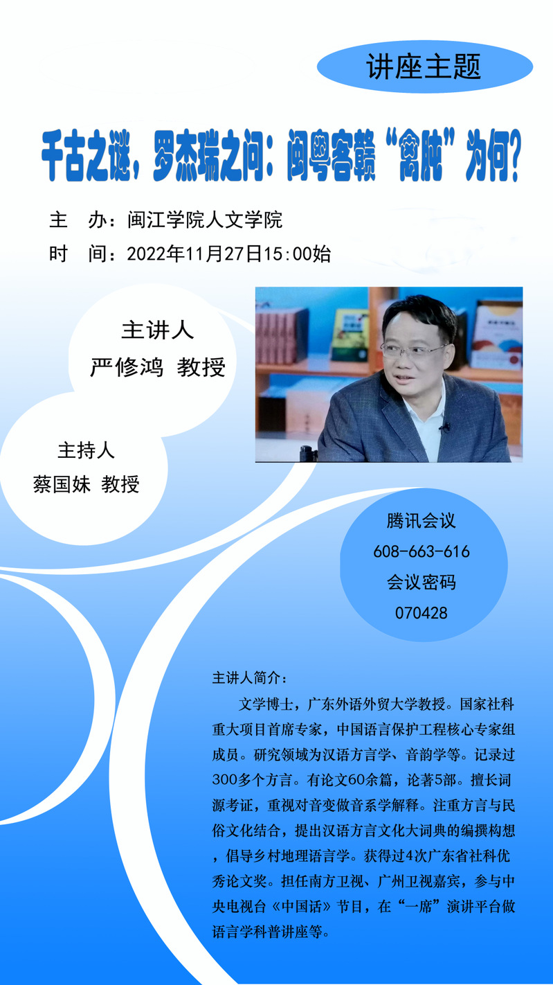为了做好好色tv 中国语言文学一级学科的培育工作,提升教师学术水平,2022年11月27日, 好色tv 特邀请广东外语外贸大学的严修鸿教授于腾讯会议开设题为《千古之谜,罗杰瑞之问:闽粤客赣“禽肫”为何?》的线上讲座。本次讲座由汉语国际教育专业负责人蔡国妹教授主持。