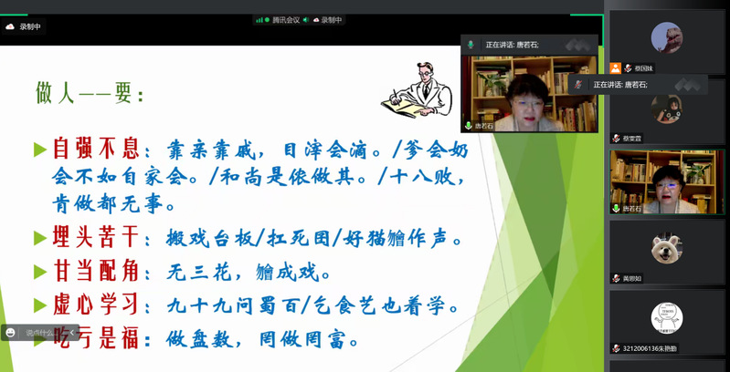 2022年12月8日晚间,由蔡国妹老师主持,唐若石教授主讲的讲座“福州熟语漫谈”在线上开展。本场讲座以福州熟语为例,挖掘出熟语中蕴含的人生哲理、做事的基本规则,以及对人的品德、性情、为人处世的要求,引导人们欣赏熟语中蕴含的深意和语言之美。