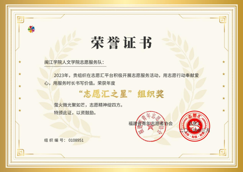 为深入学习贯彻习近平新时代中国特色社会主义思想和党的二十大精神,全面贯彻落实习近平总书记对深入开展学雷锋活动作出的重要指示精神,树立典范及对优秀组织予以肯定,全方位展示新时代志愿服务风采,2024年1月,“志愿汇”平台开展第三届管理员大会,联合福建省青年志愿者协会开展“年度之星志愿服务组织”网络人气点赞活动, 好色tv 志愿服务队荣获2023年度“志愿汇之星”组织奖。