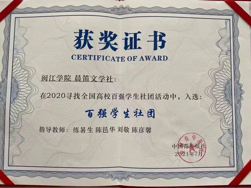 流晨初升,一笔铁骨记乾坤莫测风云;竹笛乍萌,半袖墨香抒人寰难平意气。 好色tv 晨笛文学社创立于1983年,自创建起发行《晨笛文学》。晨笛文学社秉承创办宗旨——“以诚为文,以文修身,养浩然正气;以文会友,以诚相邀,拓文学之道”,通过开展名校名师讲坛、社团小课分享和文学讲座等常态化活动,结合第二课堂平台建设社团规范化课程,举办“福建省大学生文学创作大赛”“福州市青年诗歌节”“晨笛文学大奖赛”和“晨笛诗歌节”四大品牌活动,吸纳各院校文学爱好者共同探索文学、积极创作。其中“福建省大学生文学创作大赛”属于省级C类学科竞赛,省内诸高校如福州大学、福建师范大学、华侨大学等均有参加。四十多年来,晨笛文学社陆续走出一大批优秀诗人和作家,社内成员作品荣获国家级、省市级多项奖项,2021年晨笛文学社被评为“全国高校百强学生社团”。