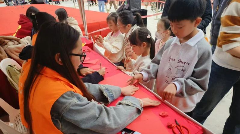 福建剪纸以其花样万千、富有山海情韵的形象吸引了一众游客。灯谜协会、古琴协会的同学们引导现场游客参与折纸、剪纸等活动,耐心讲解阴剪、阳剪等传统技法知识。游客们纷纷上手体验,纸上不断变化出窗花、花鸟鱼虫等各类图案,引起了一阵又一阵的惊喜呼喊,传统文化就在这一张张完成的剪纸作品中传承到了拿着红色剪纸的稚童手上,这一刻,“传承”成为了一个具象化的场景,生动的展现在了人们眼前。裁剪、雕刻之间,倾注了人们对生活的美好愿望。