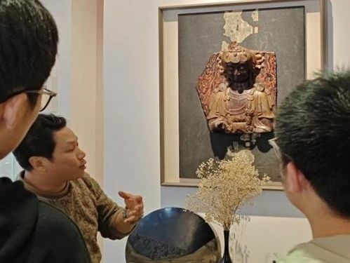 在漆画工作室,吴思冬老师向同学们指出,福建脱胎漆器发展历史悠久,创作者将漆画艺术与其他艺术相结合,构建出了全新的美学流派。他还为同学们讲解自己特意打磨出的具有磨损质地的佛像,这件作品配以仿古经文点缀,扑面而来的历史厚重感十足。