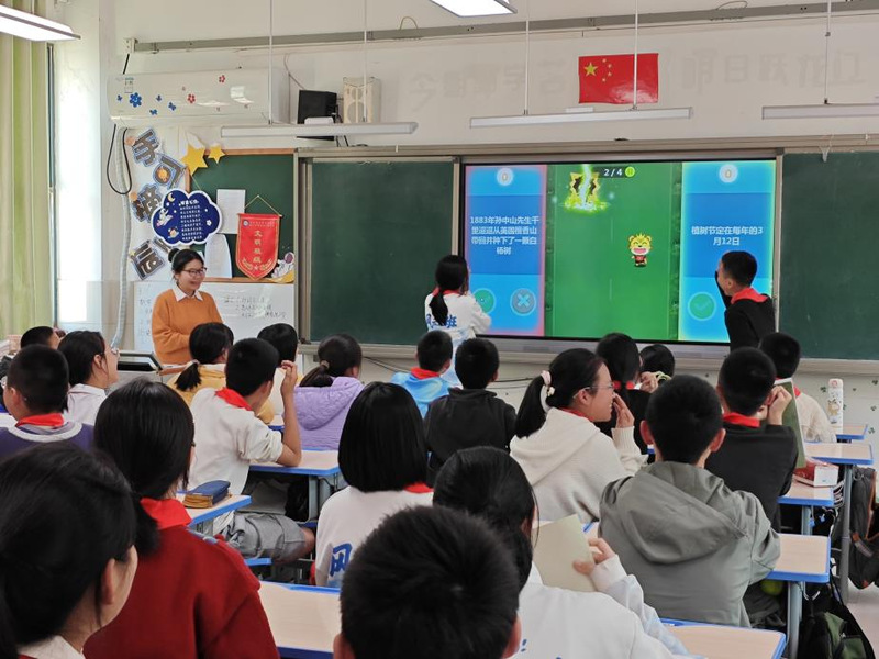 为提升课堂的实践性,志愿者结合植树节知识与环保要点设置问题,将教室划分为家庭、校园、公园等生活场景区域,组织同学们分组模拟环保行为。在家庭区,同学们演练垃圾分类投放;校园区内,大家模拟关灯节电、拧紧水龙头的操作;公园区中,各组再现劝阻游客践踏草坪的情境。通过情境实践,同学们深化了对环保行动的理解。