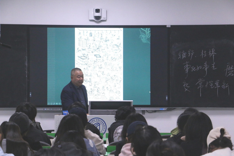 在粮食方面,刘教授对用作主食的作物如黍、稷、麦、稻等进行了介绍,展示了洛阳烧沟、贵港罗泊湾等遗址出土的作物遗存及相关文字资料。讲到墓葬中出土的粮食时,刘教授还板书“事死如事生”,阐释了汉代人的生死观念。他介绍了画像石上的仓廪图像与“狗逮耗子”画像,指出在汉代狗可能是抓老鼠的主力。此外,刘教授讲解了粮食的食用方式和丰富品类,强调“磨”的普及对汉代饮食发展的重大贡献,酱、豉和豆腐正是在这一背景下实现规模化生产。他还提到,汉代社会已有广告意识,会在产品上打标签以宣传其品质。