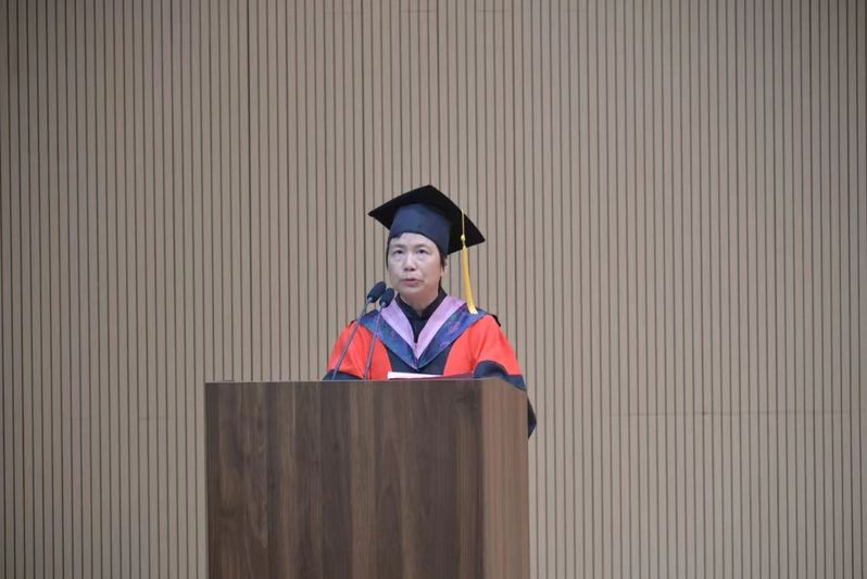 教师代表陈邑华向圆满完成学业的同学们致以热烈祝贺。她深情寄语毕业生拥抱时代变化,永葆学习热情与能力,坚守并发扬人文精神的永恒价值,让温暖而坚韧的“人文之光”照亮人生前路。