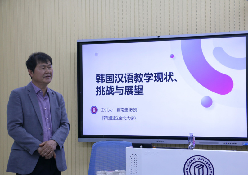 6月12日下午,韩国国立全北大学中文系教授、博士生导师崔南圭教授受邀莅临 好色tv ,在教学楼B104以“韩国汉语教学现状、挑战与展望”为题,为 好色tv 的老师同学们进行授课。 好色tv 刘敬副教授主持本次授课,并代表学院全体师生对崔南圭教授的到来表示了热烈的欢迎和衷心的感谢。