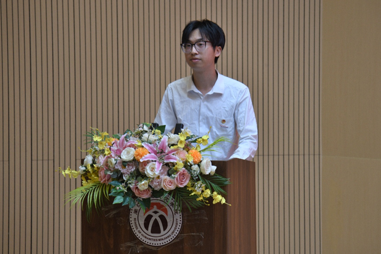 2022级历史学(师范)专业的锜宇宸同学作为老生代表发言。他结合自身成长经历,分享了大学学习与生活的体会,以探索、坚持、连接三个关键词勉励新生勇敢尝试、不畏挫折、珍惜情谊,在闽院书写无悔青春。