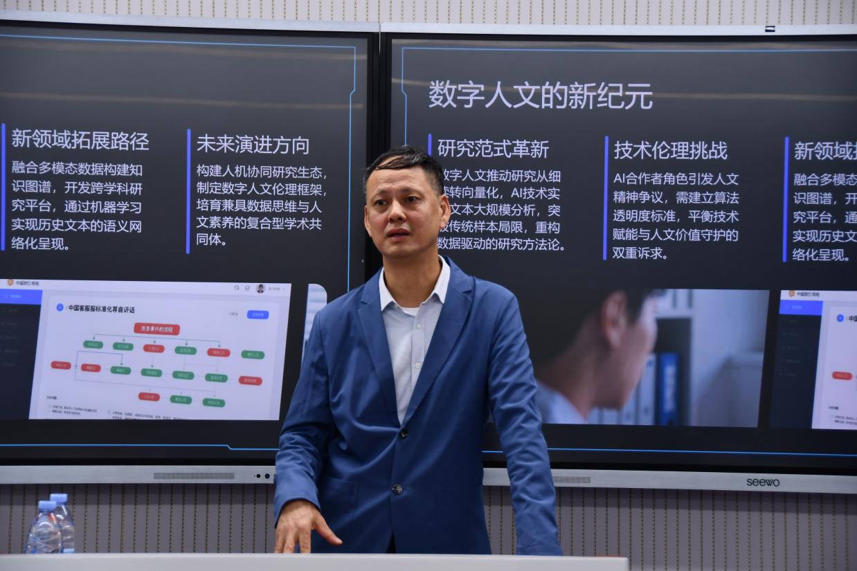 讲座中,陈硕围绕核心主题,从数字人文的内涵演进切入,系统剖析了人工智能技术对传统人文学科研究方法、传播路径及学术生态的重塑作用。他结合具体案例,生动阐释了大数据分析、自然语言处理、机器学习等技术在古籍整理、文献考据、文化遗产数字化保护等领域的创新应用,让在场师生直观感受技术赋能下人文研究的新可能。