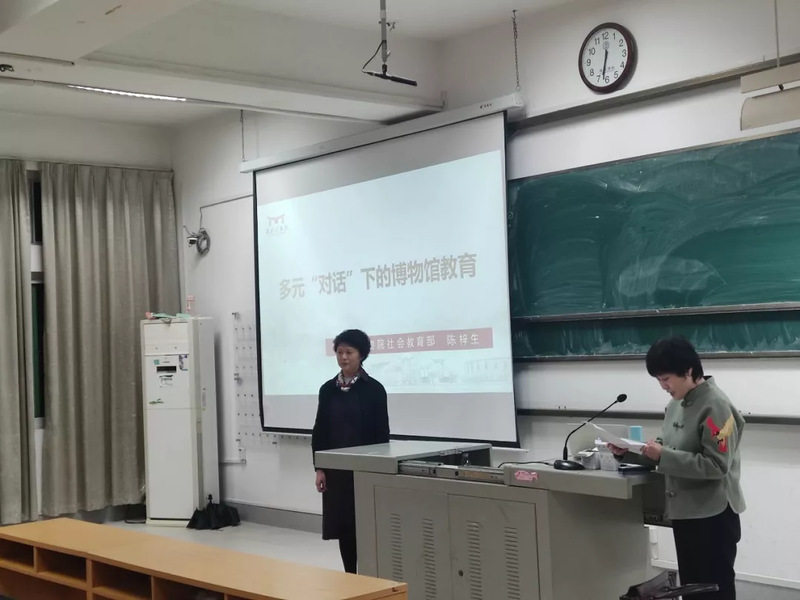 陈梓生研究馆员首先通过——你觉得什么是博物馆教育?这一问题与台下的同学们进行互动问答,活跃现场气氛。紧接着,陈梓生研究馆员从什么是博物馆教育与中国博物馆社会教育工作发展概况两个方面切入主题,向同学们详细介绍了博物馆教育的定义以及中国博物馆社会教育工作发展的历史以及如今的现状。