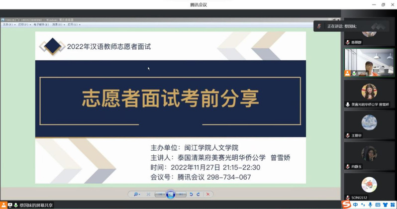 面试考前分享会于2022年11月27日晚举办,由蔡国妹教授主持,泰国清莱府美赛光明华侨公学的曾雪娇老师进行经验分享。