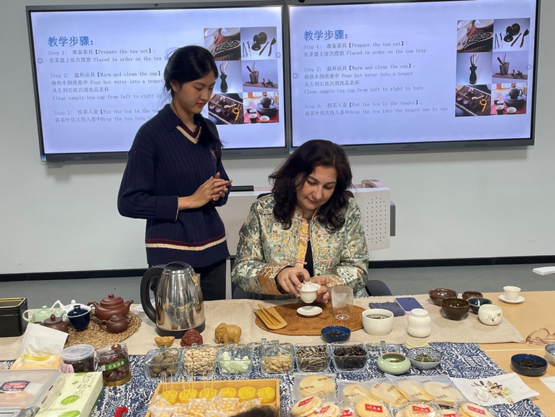 来自2021级汉语国际(教育)专业的杨楚妮同学用全英文向外教介绍了中国的茶文化,叶可灵同学向外教们展示了福建功夫茶的茶艺表演。刘敬老师带着外教们品尝了大红袍、铁观音、岩茶、白毫银针等福建茗茶,感受不同茶种独特的口感和韵味,让外教们全方位深度体验了福建茶文化的魅力。在品茗过程中,中塞师生就两国文化的异同展开了生动有趣的对谈,现场气氛温馨热烈。