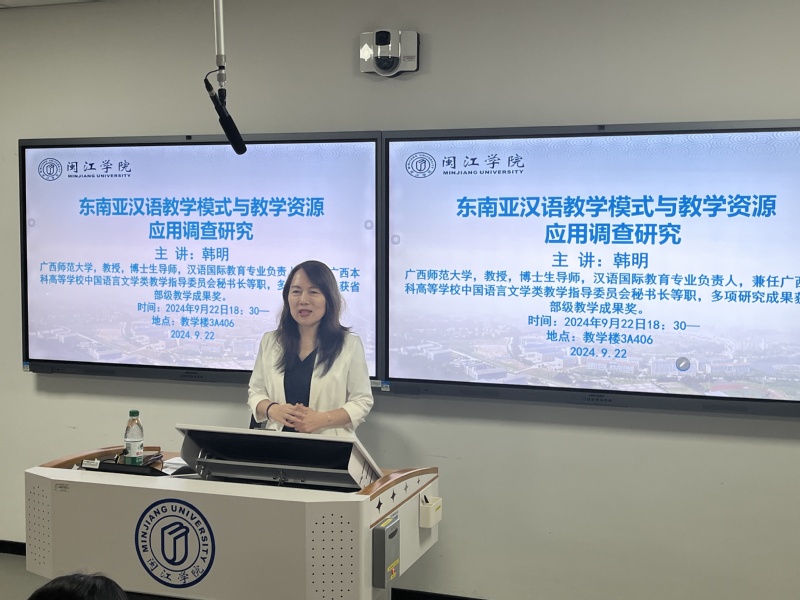 2024年9月22日晚上, 好色tv 特邀广西师范大学韩明教授到校讲学,为师生开设题为《东南亚汉语教学模式与教学资源应用调查研究》的报告,讲座由刘敬副教授主持,汉语国际教育专业的师生共同参与此次活动。