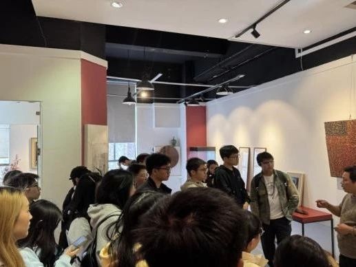 在漆画工作室,吴思冬老师向同学们指出,福建脱胎漆器发展历史悠久,创作者将漆画艺术与其他艺术相结合,构建出了全新的美学流派。他还为同学们讲解自己特意打磨出的具有磨损质地的佛像,这件作品配以仿古经文点缀,扑面而来的历史厚重感十足。