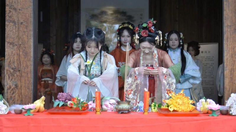 在花神祭祀典礼上,汉服协会的同学们身着各式华美汉服,循传统仪轨敬献花神,焚香祝祷,祈福风调雨顺,表达对自然恩泽的敬意。
