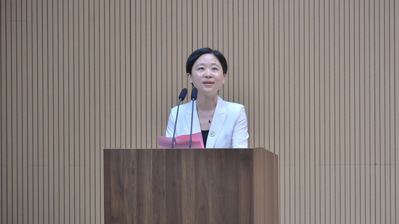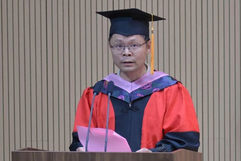 教师代表陈邑华向圆满完成学业的同学们致以热烈祝贺。她深情寄语毕业生拥抱时代变化,永葆学习热情与能力,坚守并发扬人文精神的永恒价值,让温暖而坚韧的“人文之光”照亮人生前路。