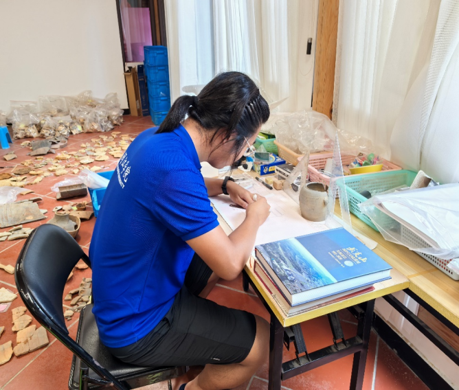 粽叶垅遗址作为闽越王城的组成部分之一,埋藏着许多历史器物。除了实地参观,同学们也参与到陶瓷器等器物的绘制与修复。他们抚过陶瓷器的内外壁,感受着纹饰与形状,手执尺笔,将器物的整体及每一处细节测量并绘制到图纸中。在修复过程中,队员们把许多陶器碎片不断地进行比对、拼接。在完成这些工作的过程中,队员们不仅通过古器物加深了对闽越王城的了解,更是深刻体会到了前人的智慧匠心。