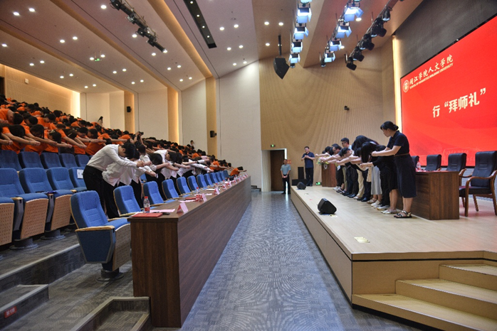 师道永续,礼传薪火。在毛晓阳教授的引领下,典礼进入了极具人文传统的“拜师礼”环节。全体新生行四拜高揖之礼,教师垂手恭受前两拜后,执礼回拜。这一仪式既弘扬中华尊师重道传统,也象征师道传承、学有所依,师者担责、学者有归。