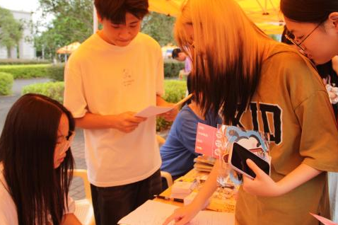 灯谜协会的摊位前,同学们在一条条灯谜下驻足思索,时而蹙眉,时而击掌,在协会成员的巧妙点拨下,传统灯谜的智慧与趣味被彻底激活。另一边的溯光话剧社则充满了欢声笑语,经典话剧片段变为互动游戏,让参与者亲身感受话剧之美。